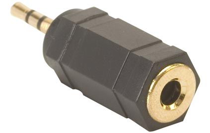 Adaptador de conector macho (plug) 2,5 mm a conector hembra (jack) 3,5 mm, estéreo.