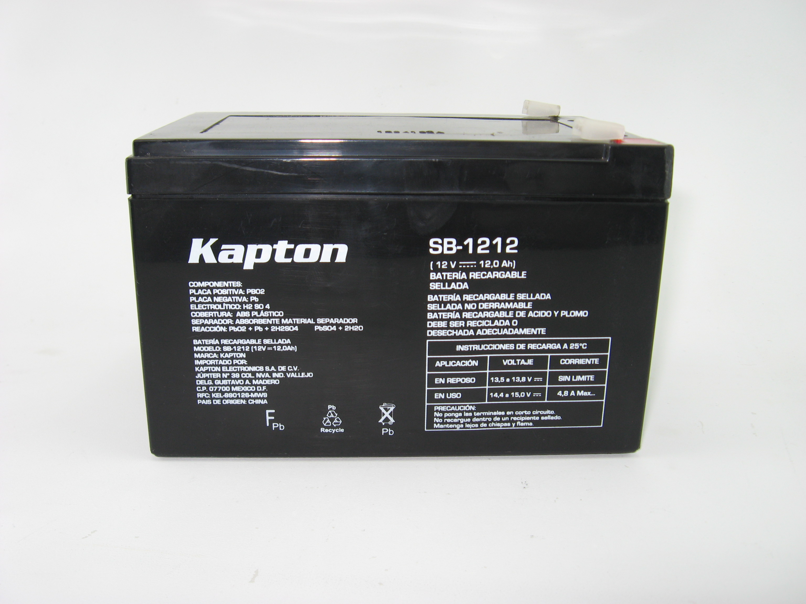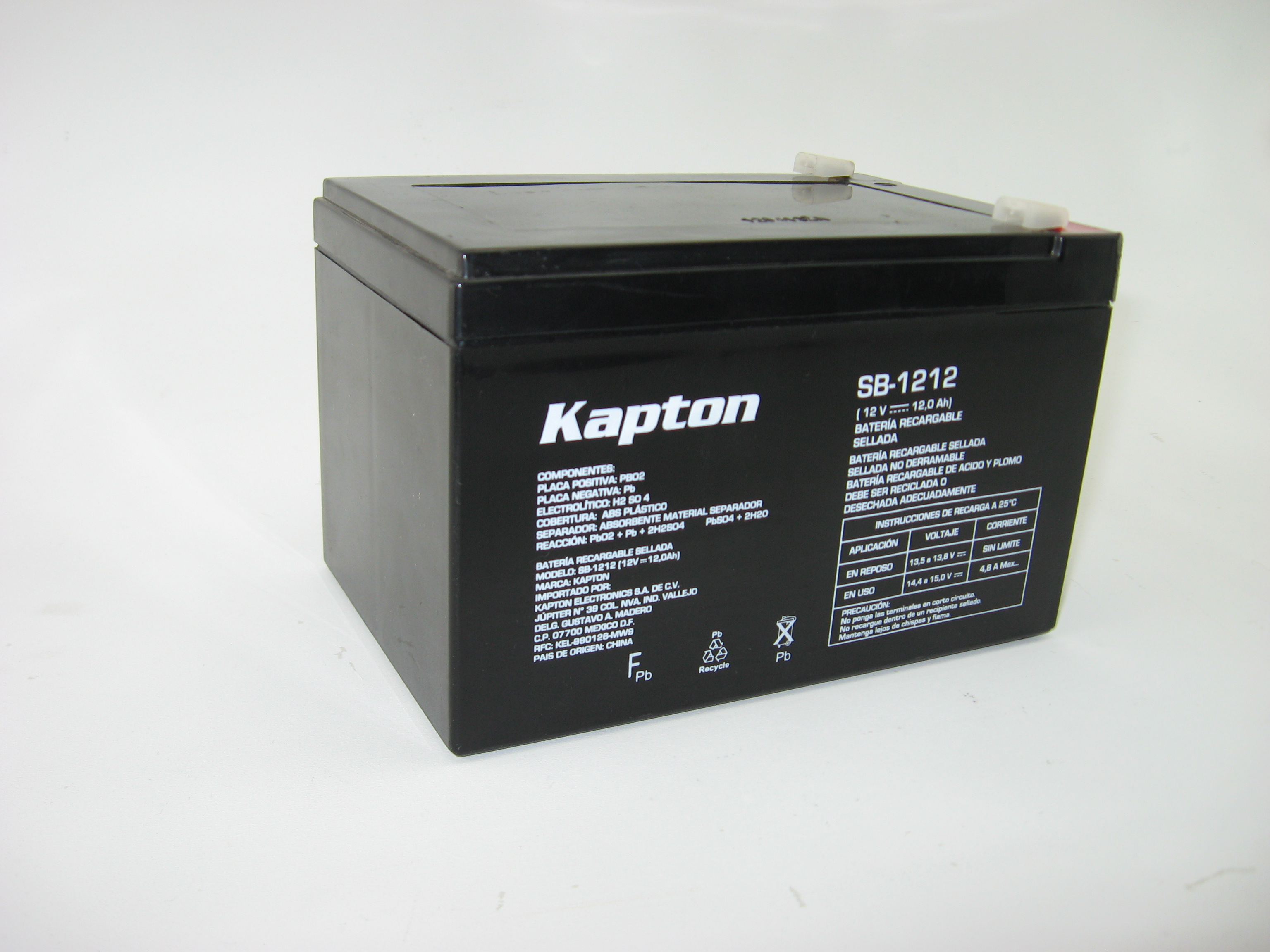 | Batería recargable sellada, de ácido-plomo, de 12 Vcc, 12 Amperes/hora y hasta 1000 ciclos de carga/descarga. Util para alimentar No breaks, lámparas de emergencia, alarmas, juguetes, cámaras de video, equipos de sonido portátiles y más. Dimensiones: 15 x 9,5 x 9,7 cm - Peso: 3,584 Kg |