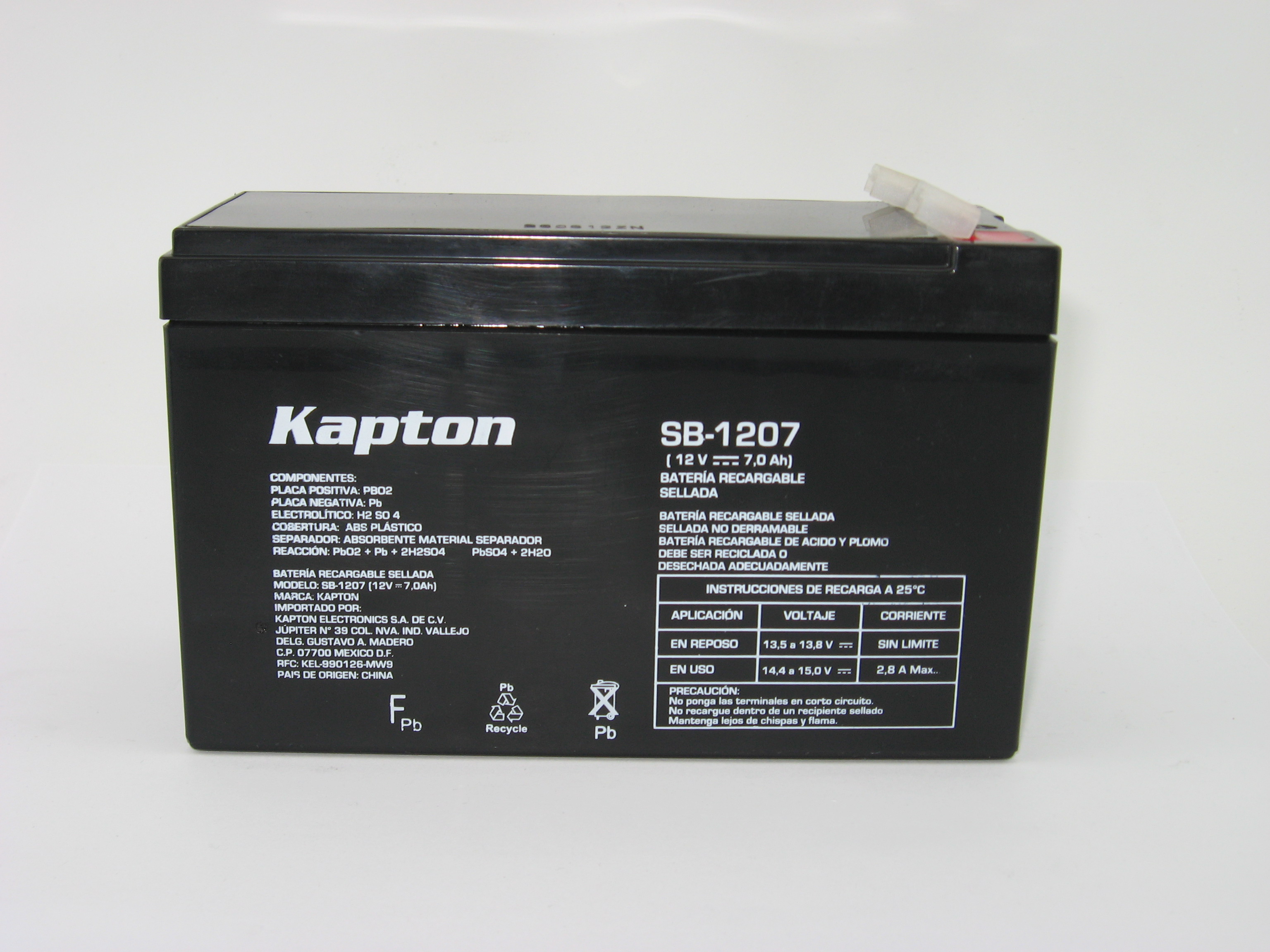 | Batería recargable sellada, de ácido-plomo, de 12 Vcc, 7 Amperes/hora y hasta 1000 ciclos de carga/descarga. Util para alimentar No breaks, lámparas de emergencia, alarmas, juguetes, cámaras de video, equipos de sonido portátiles y más. Dimensiones: 15 x 9,4 x 6,5 cm - Peso: 2,182 Kg |