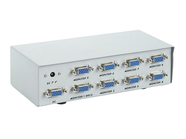 "Divisor activo de 8 puertos para monitores VGA, que permite ver en 8 monitores la misma señal de una computadora, sin degradación o pérdida de calidad en la imagen. "