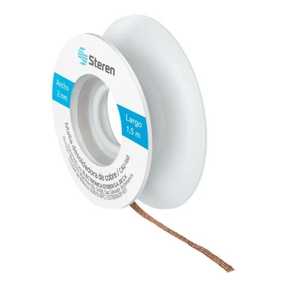 Malla desoldadora de cobre, de 2 mm de ancho por 1,5 m de longitud. Su presentación es en carrete cubierto. Ideal para retirar soldadura de nodos de circuitos impresos.