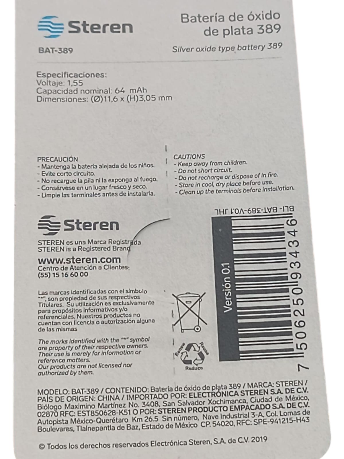 Pila de óxido de plata tipo botón "389"