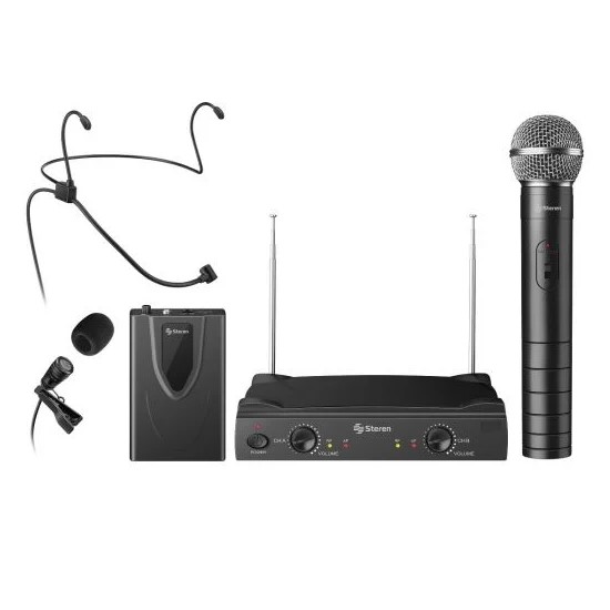 Sistema de 2 micrófonos inalámbricos VHF, de mano y solapa o diadema